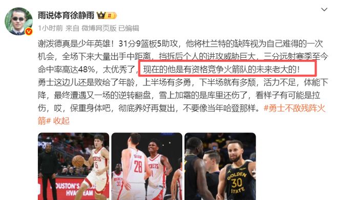 国内名嘴徐静雨就在社媒上表示,谢泼德未来可以成为火箭老大!杜兰特今年已经37岁,他再打2-3年可能就会退役,而阿门、申京、小贾巴里史密斯是火箭的建队核心,如今,21岁的谢泼德也打出来了,他比杰伦格林更好用,而且也愿意将精力放在防守端,所以未来成为火箭外线头号得分手,不是不可能!